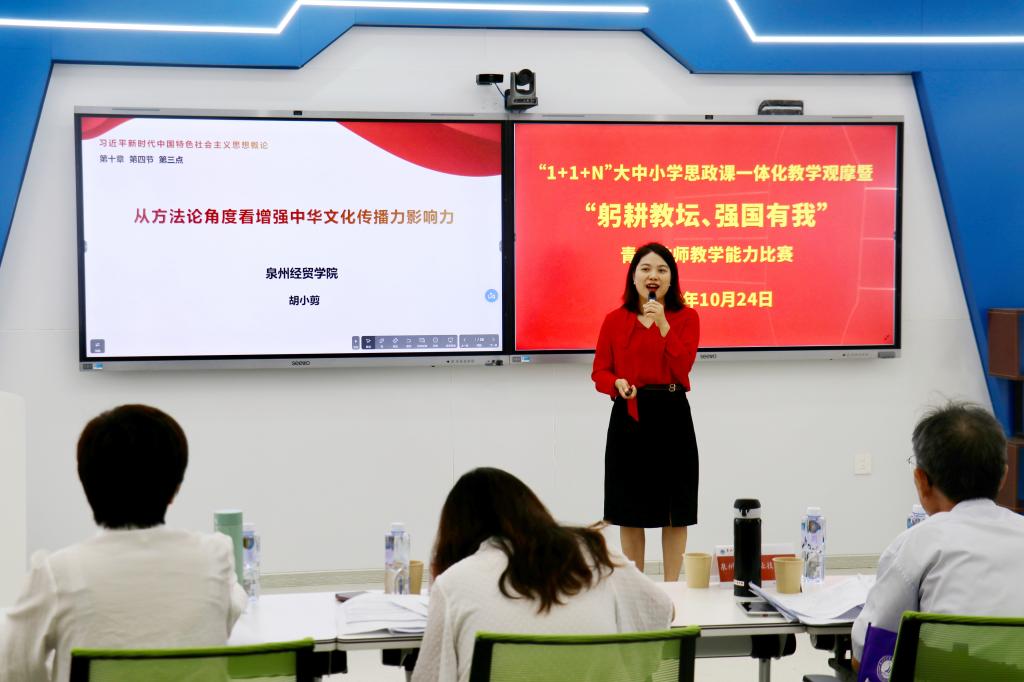 10月24日,学院“1+1+N”大中小学思政课一体化教学观摩暨“躬耕教坛、强国有我”青年教师教学能力比赛在新教学楼201智慧教室举办。学院党委委员、副院长沈永希,杨灿荣教授,泉州海洋职业学院、泉州七中、泉州六中、及南安仑苍中学等联盟单位教师代表,学院思政课教师、学生代表参加。